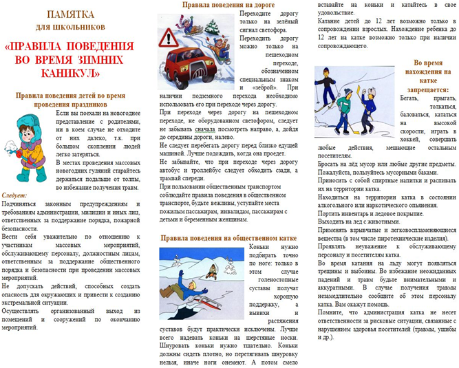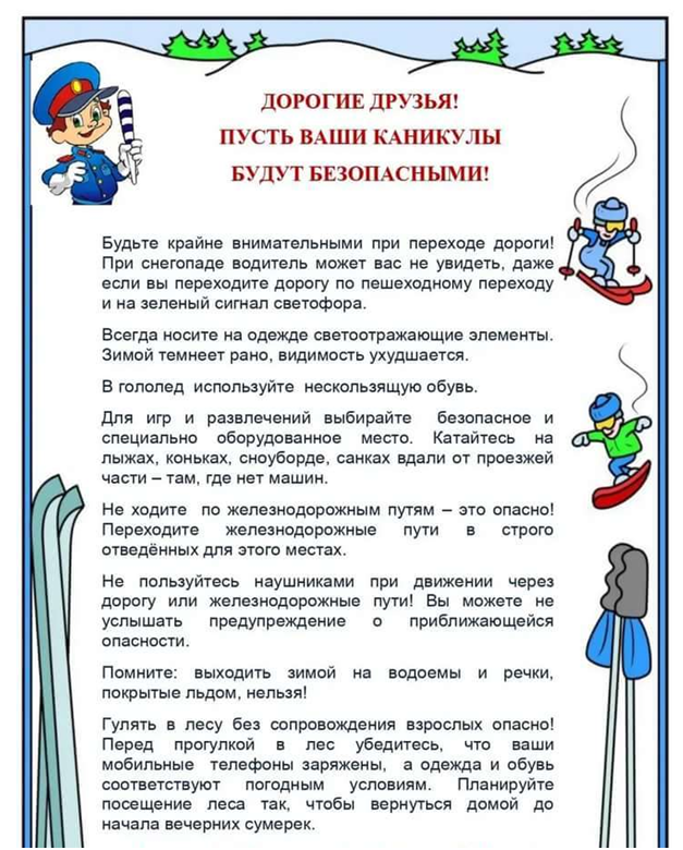 Уважаемые родители! С началом зимних каникул у Ваших детей увеличивается количество свободного времени, которое они часто проводят без должного контроля со стороны взрослых. Это может привести к угрозе жизни и здоровья детей, совершению правонарушений. Чтобы дети хорошо отдохнули, не совершили противоправных действий родителям рекомендуется: