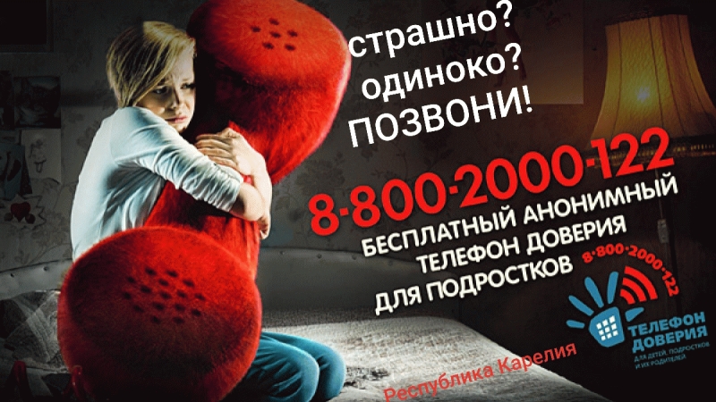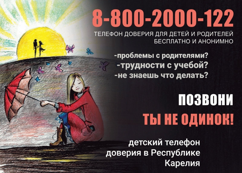 В рамках Соглашения между Правительством Республики Карелия и Фондом поддержки детей, находящихся в трудной жизненной ситуации, осуществляет работу Общероссийский детский телефон доверия с единым общероссийским номером 8-800-2000-122 (далее - телефон доверия), целью работы которого является оказание экстренной психологической помощи детям, подросткам и их родителям, содействие защите прав несовершеннолетних, сбор сигналов о случаях подозрения на жестокое обращение с детьми. Психологическая помощь с использованием телефона доверия оказывается анонимно, бесплатно и круглосуточно.