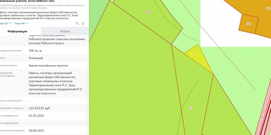 Лот №1.Право заключения договора аренды земельного участка из земель населенных пунктов, имеющего кадастровый номер 10:02:0090107:362, площадью 100 кв.м., местоположение: Республика Карелия, Кемский муниципальный район, Рабочеостровское сельское поселение, п. Рабочеостровск, вид разрешенного использования - «Офисы, конторы организаций различных форм собственности; торговые павильоны и киоски. Территориальная зона - П.2. Зона производственных предприятий III-V классов опасности».