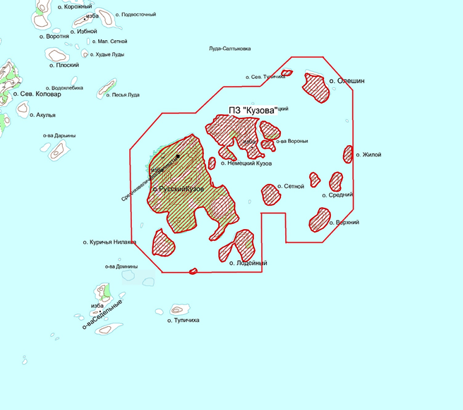 1.3. На территории Кемского района и включает в себя острова Кузовецкого архипелага Кемских шхер Белого моря (острова Русский Кузов, Немецкий Кузов, Олешин, Верхний, Средний, Жилой, Сетной, Лодейный, Вороньи, Куричья Нилокса, Чернецкий, Северная Тупичиха).