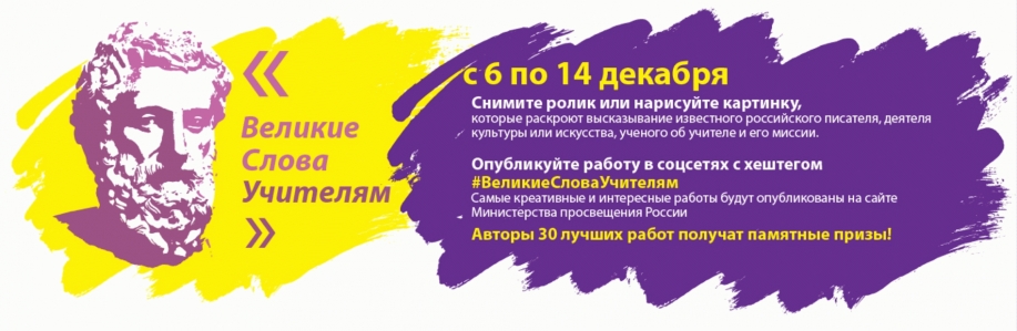Выразить учителям признание, сказать приятные слова об их труде, сделать это красиво, точно, выразительно и креативно поможет акция «Великие Слова Учителям». Чтобы принять в ней участие, необходимо найти понравившееся высказывание известного российского писателя, деятеля культуры или искусства, учёного об учителе и его миссии, снять небольшой ролик или сделать рисунок, который раскроет и проиллюстрируют смысл фразы.
