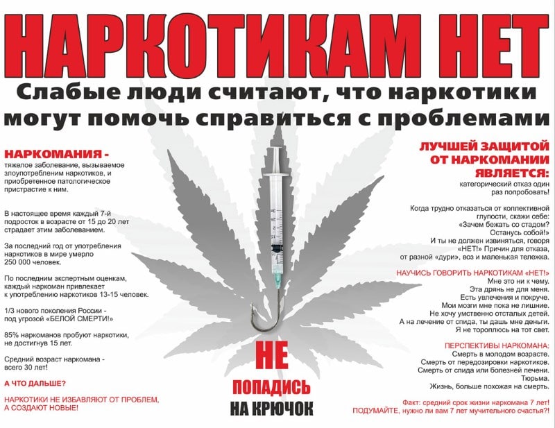 Наркомания на сегодняшний день - одно из самых страшных явлений нашей современности. С каждым днем все больше людей попадает в страшные сети порока, стараясь при помощи него скрыться от ежедневных проблем. Плата за подобные эксперименты над собственной жизнью безгранично велика, а результаты порой необратимы. Выбор человека - его шаг, но выбрать из двух возможных вариантов «за» и «против» наркотики - это непростительное и пагубное решение для любого. Употребление наркотических и токсических препаратов ведет к моральной деградации личности, физически разрушает организм и приводит в итоге к смерти. Также страдают родные и близкие люди такого человека, а государство теряет полноценного, работоспособного гражданина.