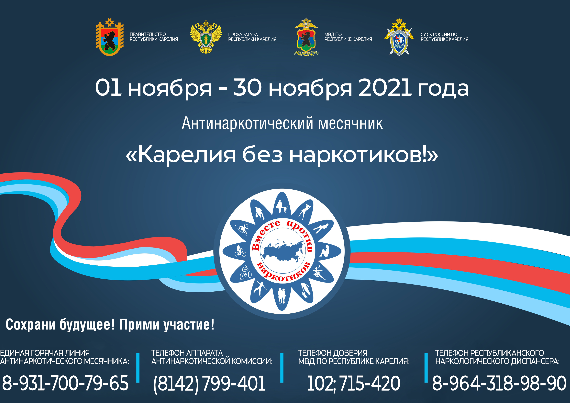 В период с 01 ноября по 30 ноября 2021 года Правительство Республики Карелия, Прокуратура Республики Карелия, МВД Республики Карелия и СУ СК России по Республики Карелия, проводят акцию – антинаркотический месячник. Телефоны горячей линии указаны на логотипе акции.
