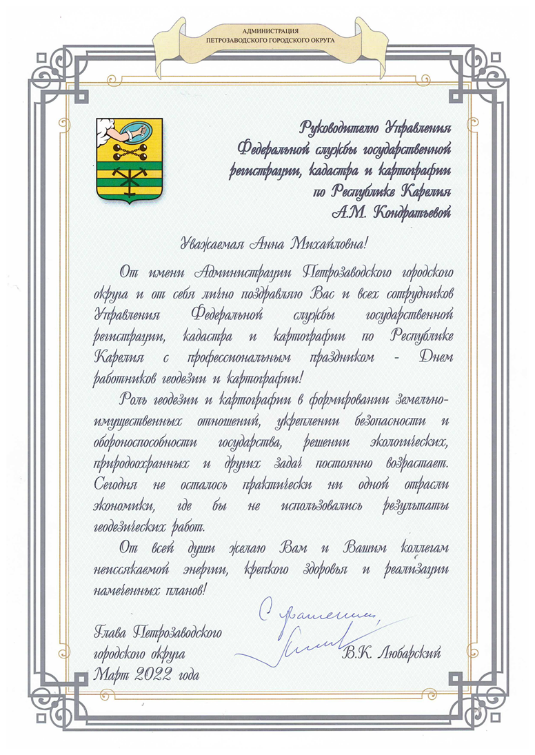 От имени Администрации Петрозаводского городского округа и лично от Главы Любарского Владимира Константиновича поздравление руководителю Управления Росреестра Кондратьевой Анне Михайловне и всем сотрудникам с профессиональным праздником - Днем работников геодезии и картографии!