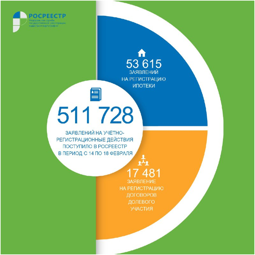 За минувшую рабочую неделю c 14 по 18 февраля 2022 года на учётно-регистрационные действия в Росреестр было подано в общей сложности 511 728 заявлений. На регистрацию ипотеки поступило 53 615 заявлений, а на регистрацию договоров долевого участия (ДДУ) – 17 481.