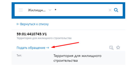 Для создания обращения, связанного с земельным участком или территорией, имеющими потенциал вовлечения в оборот для жилищного строительства, необходимо нажать на ссылку «Подать обращение» в информационном окне по соответствующему объекту.
