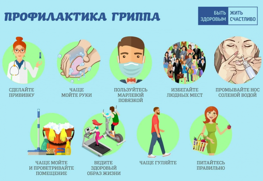 Единственный метод специфической профилактики гриппа — это ежегодная вакцинация за 2–3 недели до наступления подъёма заболеваемости. Прививка от гриппа защищает организм от заражения вирусами гриппа, но не защищает от более чем 200 других видов ОРВИ, поэтому даже после прививки нужно соблюдать меры неспецифической профилактики респираторных инфекций.