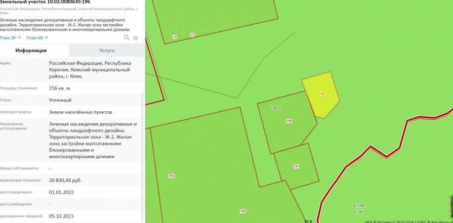 Лот №2.Право заключения договора аренды земельного участка из земель населенных пунктов, имеющего кадастровый номер 10:02:0080630:196, площадью 156 кв.м., местоположение: Республика Карелия, Кемский муниципальный район, Кемское городское поселение, г. Кемь, вид разрешенного использования - «Зеленые насаждения декоративные и объекты ландшафтного дизайна. Территориальная зона - Жилая зона застройки малоэтажными блокированными и многоквартирными домами Ж-2».